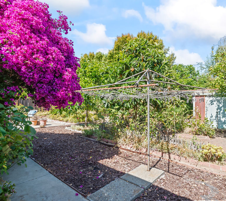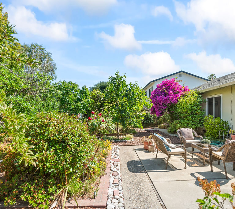 Lovely exterior spaces include canopy of shade from mature tree and vibrant roses in front yard to welcome you home while the backyard is a true oasis with spacious hosting deck, paved area great for extra seating or basketball hoop, mature fruit trees including pink lemon tree, and large storage shed.